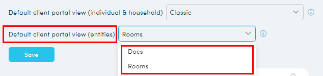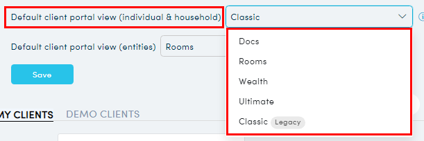 2. The Client settings area opens. Select a default client portal view (from the drop down list) for both individual/household clients and entity clients.