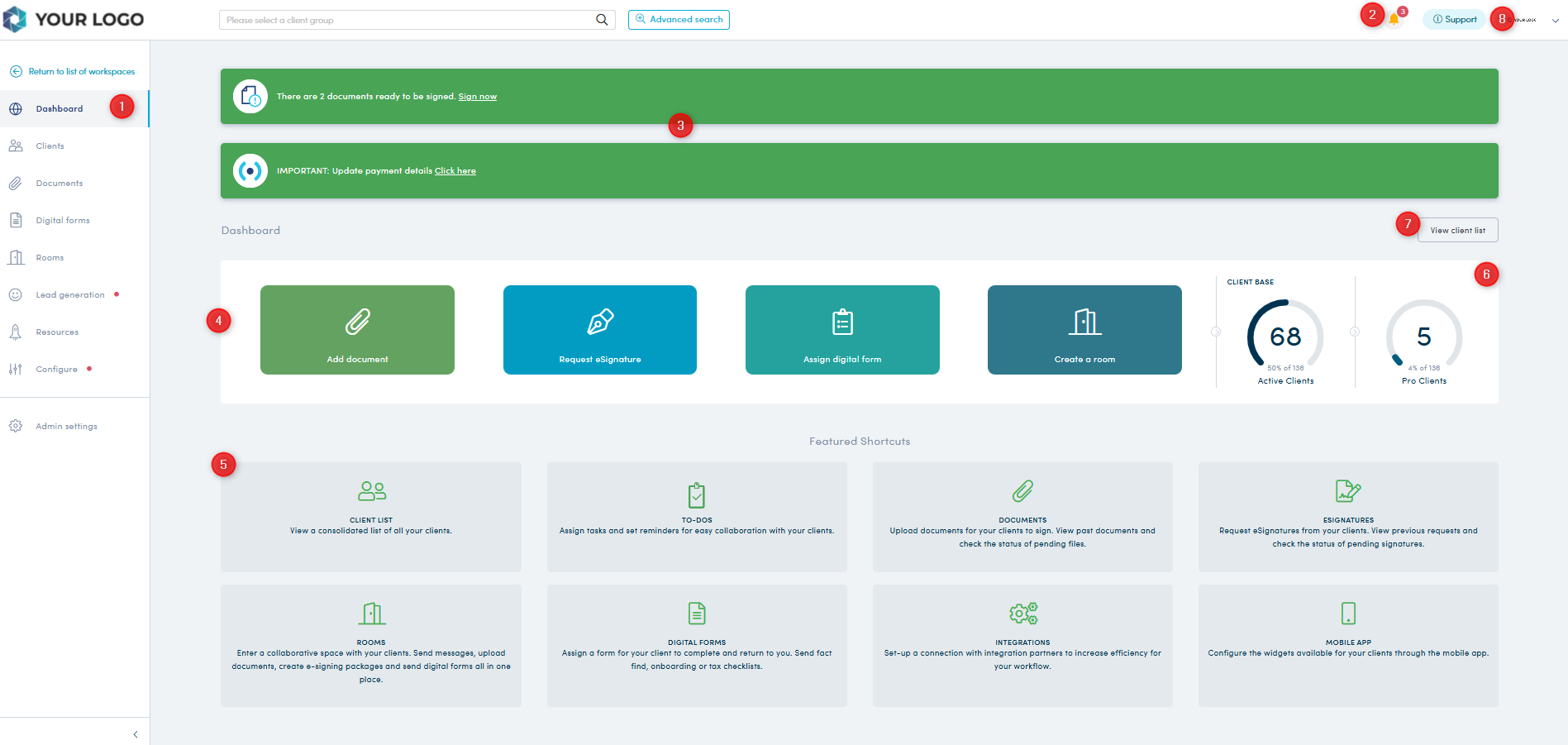 -Pro Clients: all billable paid monthly subscription of a workspace/client file that you are the primary firm for. client groups account for one workspace. eg. Bob's firm has 7 client workspaces - Harry & Brenda (group) have a pro account, Barry Marz is a pro account but is an external client and all the other clients are starter files. Bob's firm are only charged for 1 pro account.- View client list: takes you straight to the client list page to view all clients you are assigned to or are able to view.