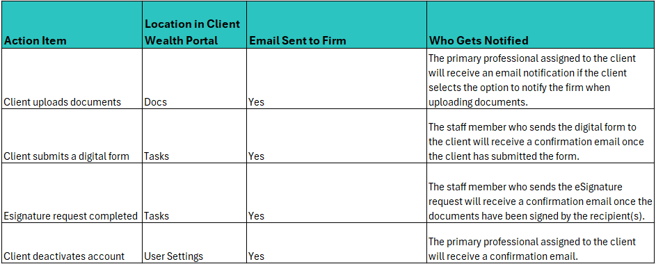 To keep your team informed and ensure smooth workflows, the Client Wealth portal sends email notifications to specific staff members when clients perform certain actions. These notifications help professionals stay updated on important activities such as document uploads, form submissions, eSignature completions, and account changes.