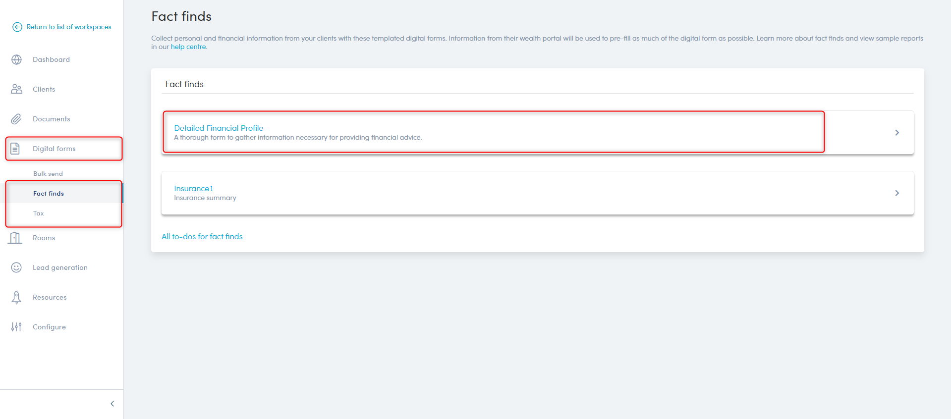 - From the left-side navigation menu, select Digital Forms and then select the relevant form (e.g. 'Fact Find' > 'Detailed Financial Profile').