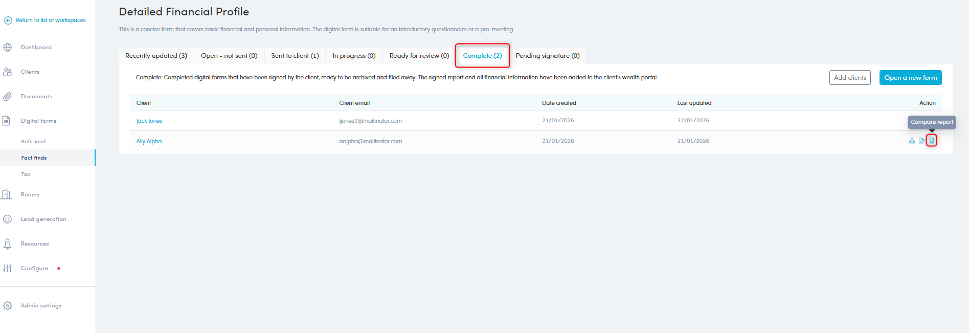 - Navigate to the relevant status tab (e.g. 'Complete'), and from the 'Action' tab for the client, select the 'Compare Report' icon: