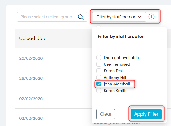 2. To view documents uploaded by a specific staff member, use the Filter by Staff Creator option. Select the staff creator and click Apply Filter.