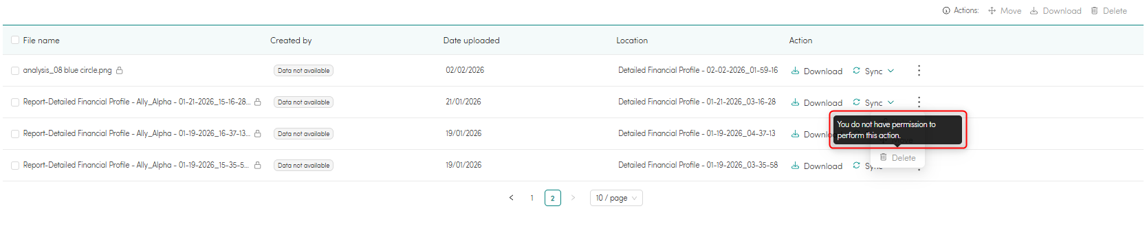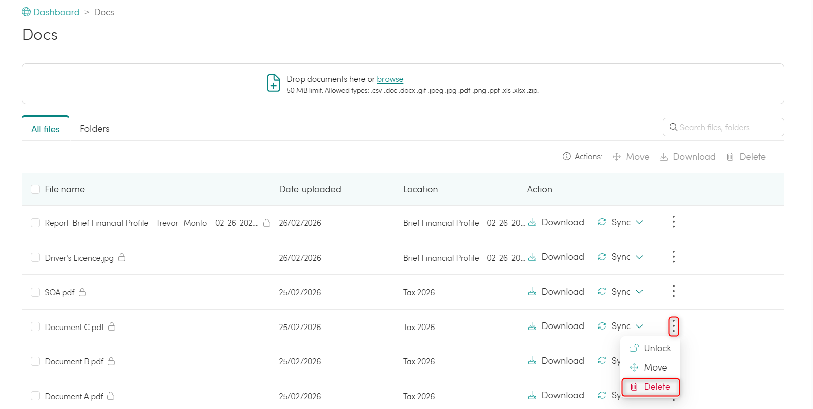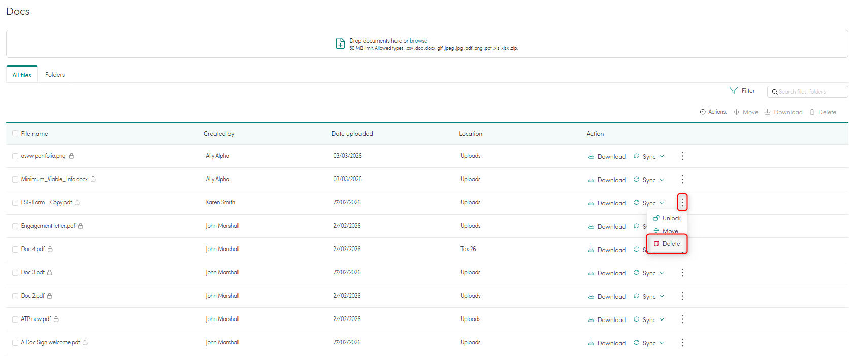 - Click on the 3 vertical dots (⋮) under the 'Actions' column inline with the document you'd like to delete, and select 'Delete'