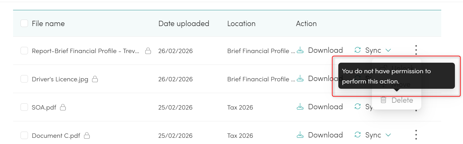 Documents uploaded in this way are protected by a permanent lock (perma lock). As a result, they cannot be unlocked or deleted from the Docs section of the client portal. This behaviour is intentional and ensures the integrity of completed records.