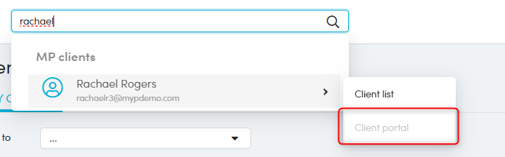 If searching for a Client (who has Private Mode enabled) in the Advanced Search bar, the client portal link will appear as greyed out, indicating the account is on Private Mode and access to their portal is restricted.