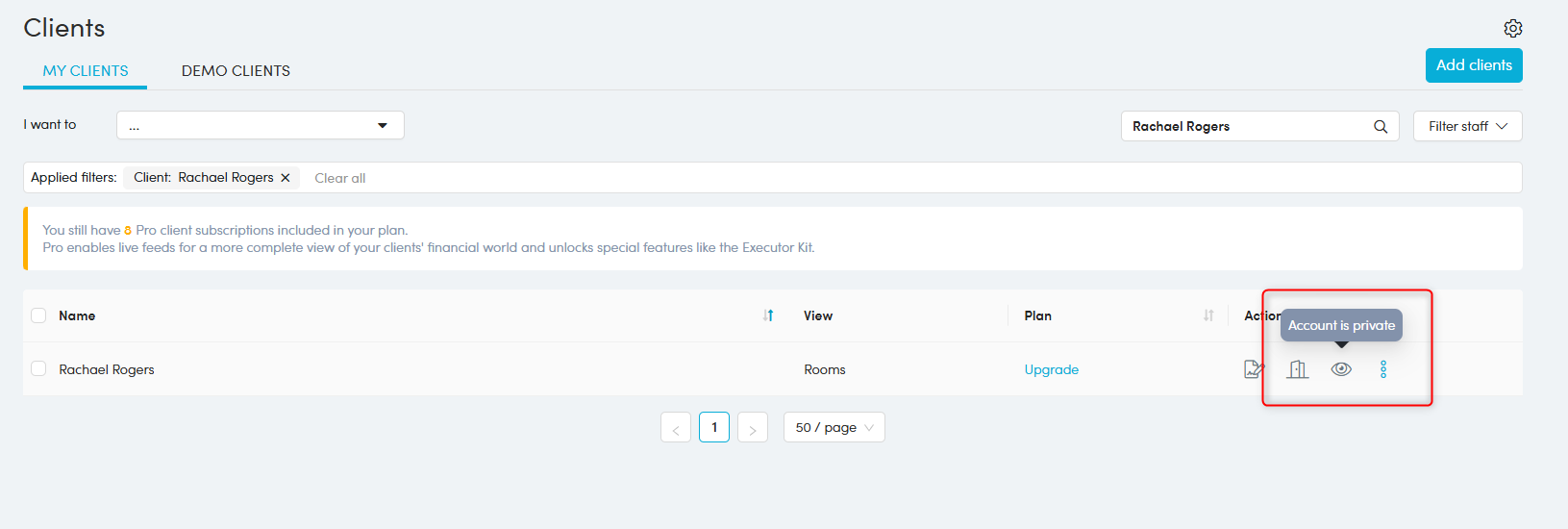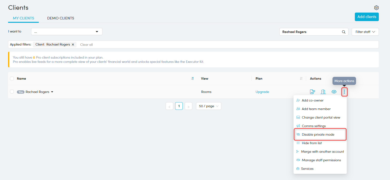 2. Navigate to the Client list and search for your account. Click the 'More actions' button and select 'Disable private mode'.