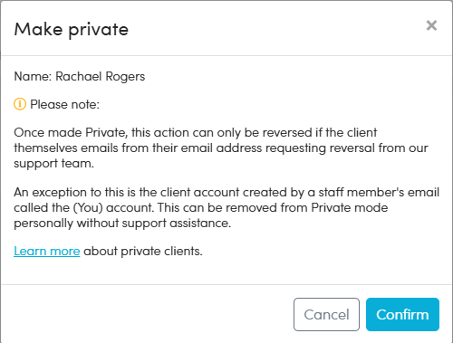 - Private Mode can be enabled by any staff member that is able to view a client in the Client list.