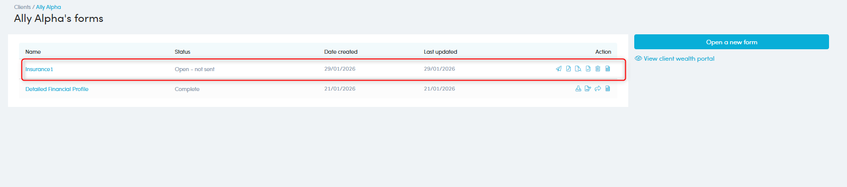 Navigate to the form you’d like to preview, either via the Actions in the Client list or the Digital forms area of the Partner portal (See How do I open a new digital form for a client?).