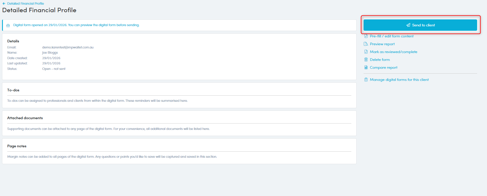 Once you are back in the form summary view, and you are ready to send the pre-filled form to the client or entity. Click 'Send to client'.
