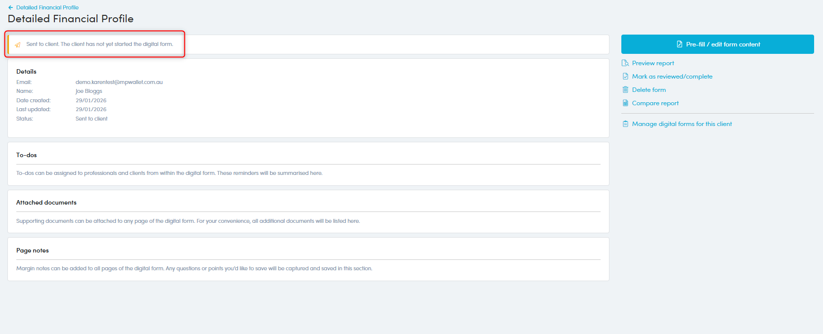 Upon clicking 'Send to client' , you will be taken to the form's summary page where you can see confirmation that it has been sent to the client or entity member.