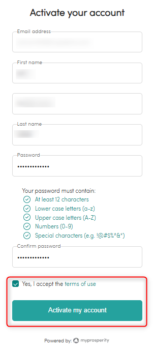 - Once a password has been selected and confirmed, click 'Accept terms of use' and then 'Activate my account'.