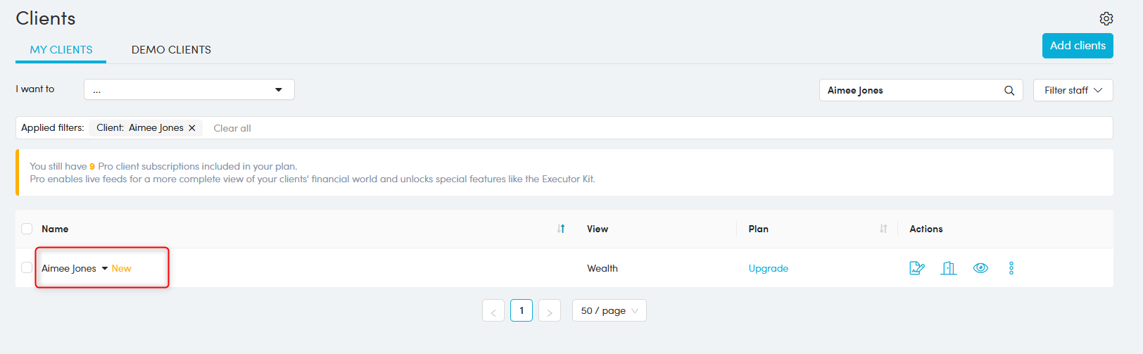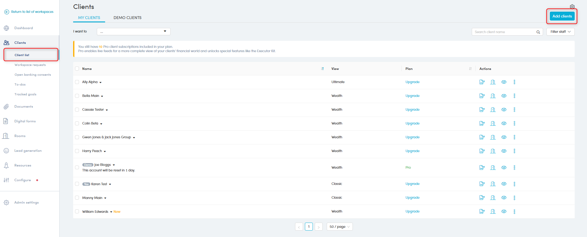The Client list is where you can create and manage all your individual clients or client groups, send invitations to join the portal, view clients’ portals, send documents for signing, send a fact find, edit their subscriptions and much more.