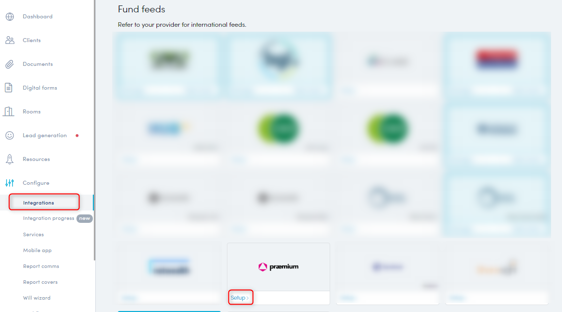 In your Partner Portal, go to Configure > Integration. Click 'Setup’ from within the Praemium integration tile.