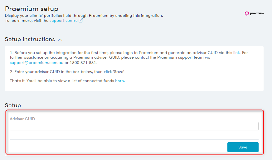 Within the setup page, enter the 'Adviser GUID' you received from Praemium. Click ‘Save’.