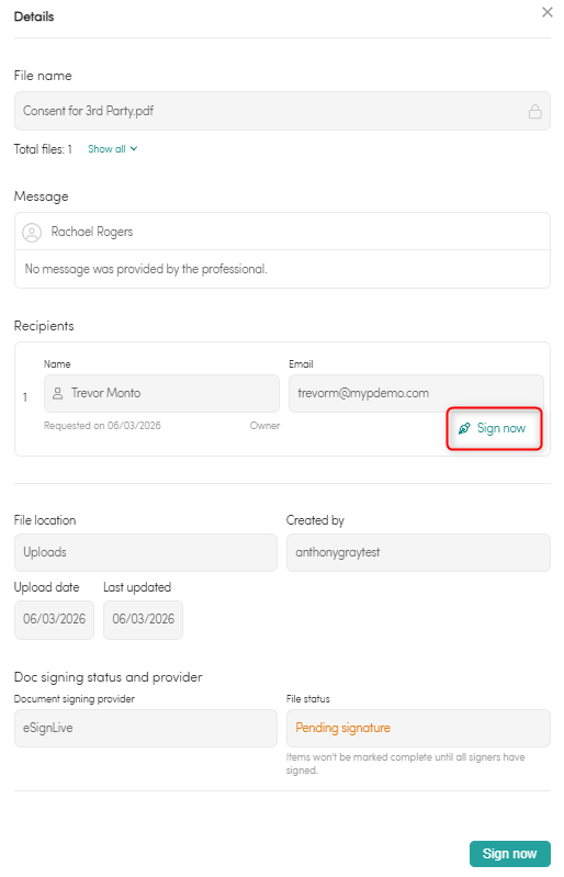 Within the 'Recipients' section, the client should click the 'Sign now' button underneath their name.