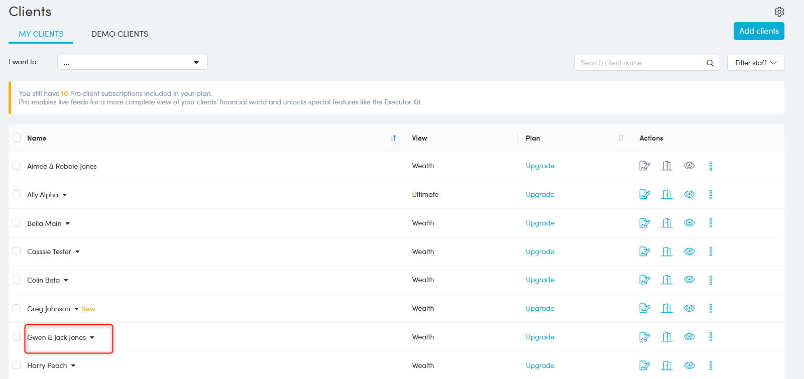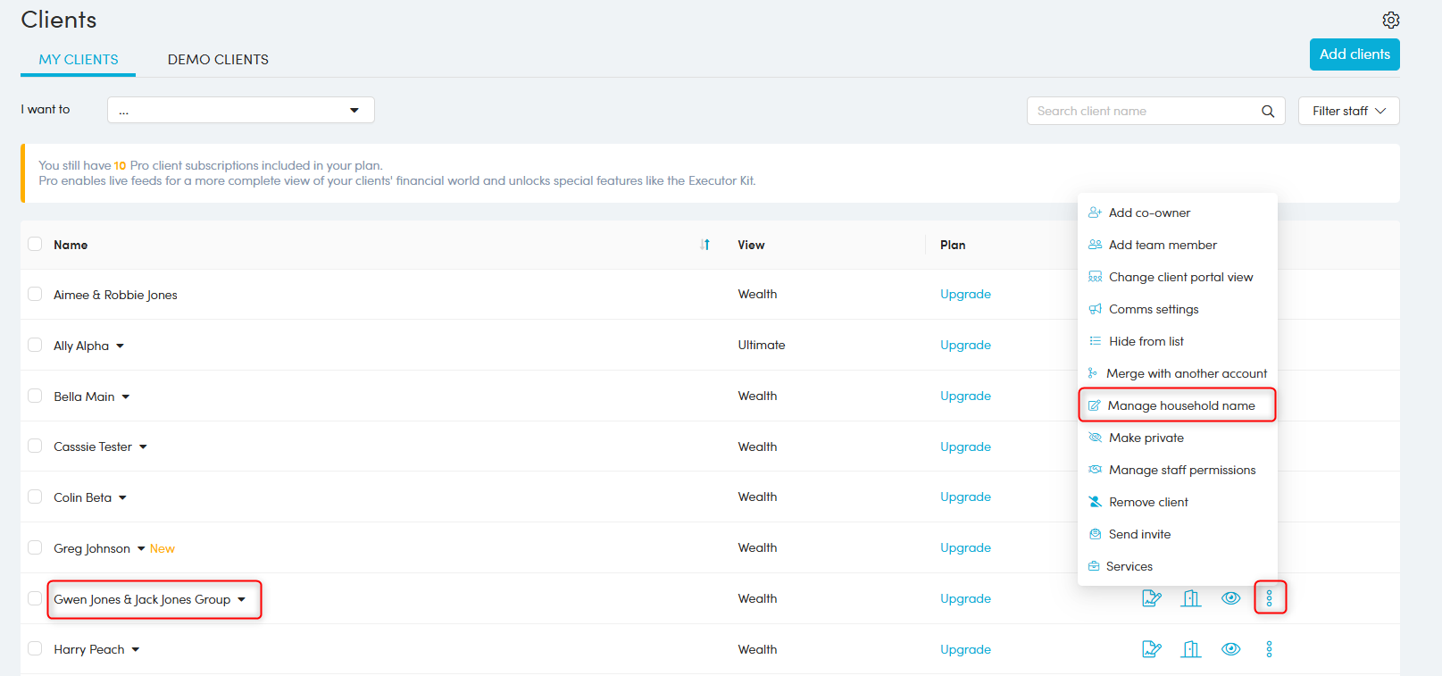 1. Locate the Client in the Client list, click 'More actions' > 'Manage Household name'.