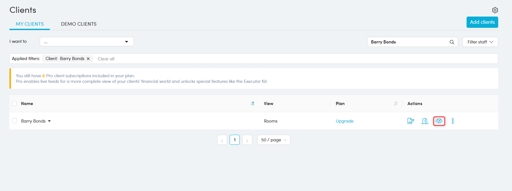 1. Locate the client in the Client list and click the viewing eye to be redirected to their portal.