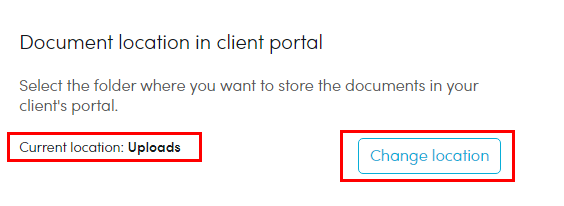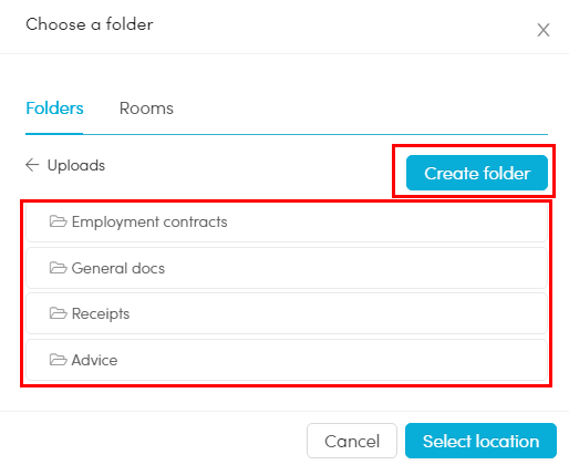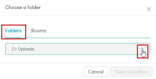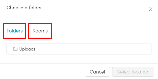 6. By default, uploaded files are stored in the Uploads location. You can choose an exisitng folder or Room by selecting 'Change location'.