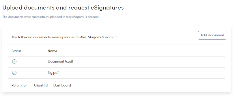 7. A confirmation page will appear, confirming that the document/s have been uploaded to the client's portal.