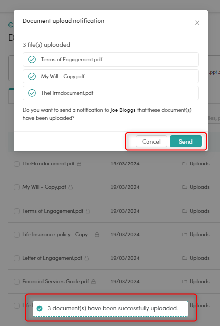 Cancel: Clicking “Cancel” will not send the recipients listed in the pop-up prompt a notification. The documents are still uploaded and stored in the portal.