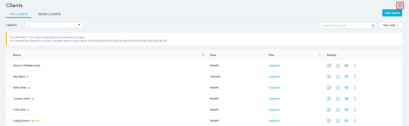 - Navigate to Clients > Client List and click the Settings cog at the top right hand side of the Client List page.