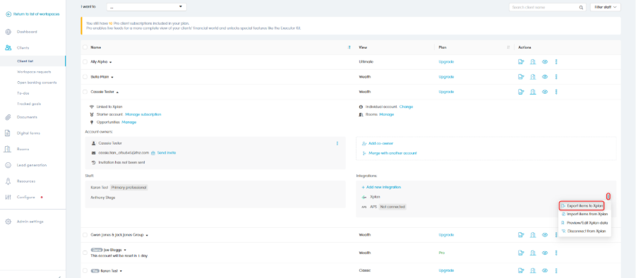 If not, you will need to choose whether to: create a new Xplan Client account, Link to an existing or Ignore.NOTE: This task only needs to be completed once, unless new team members are added into your portal. - Make your export selections by turning on/off the toggles next to each section of client data