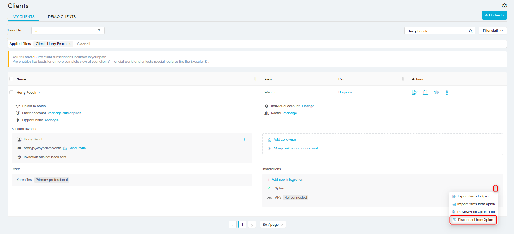 Under Integrations, select the ⋮ menu next to Xplan, then choose 'Disconnect from Xplan':