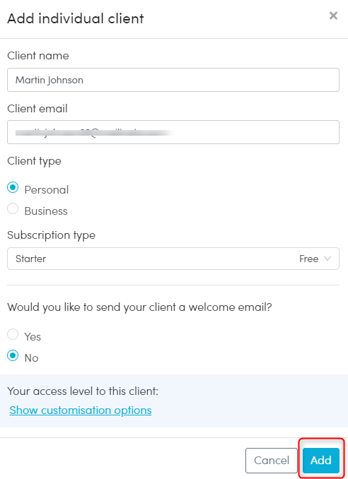 - The window is refreshed and only 1 client with an email address is shown. Click 'Add'.