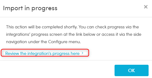 - The import has now been triggered and a confirmation window appears. Click 'Review Integration progress'.