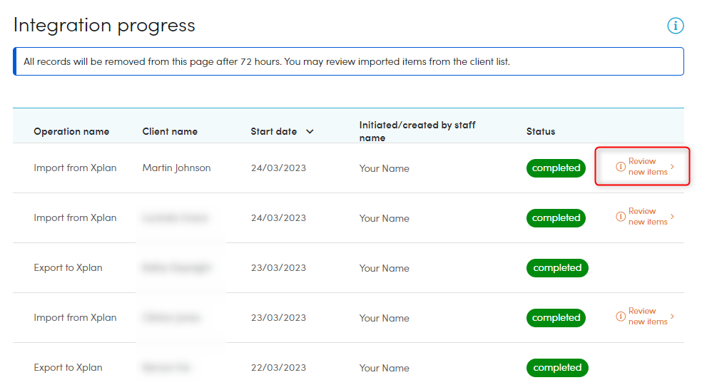 - The Integration progress screen is shown. Locate the import and click 'Review new items'.