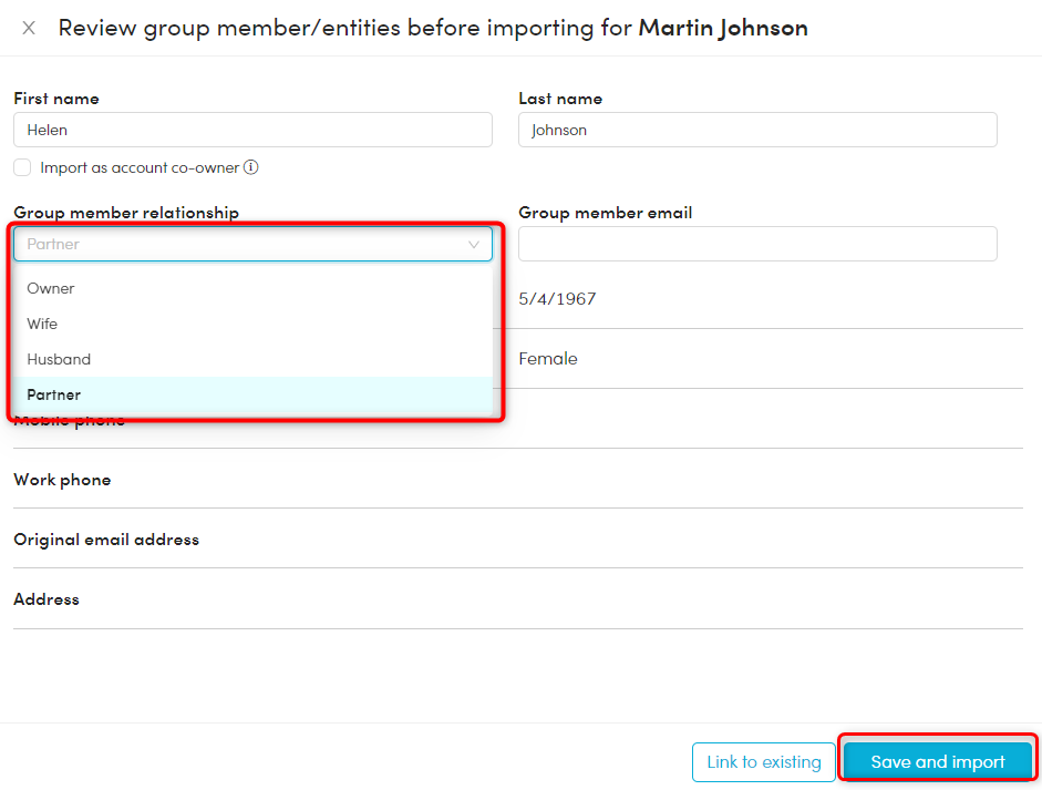 Unmark the 'Import as account co-owner' checkbox, select the client's relationship from the dropdown box and then click 'Save and Import'.