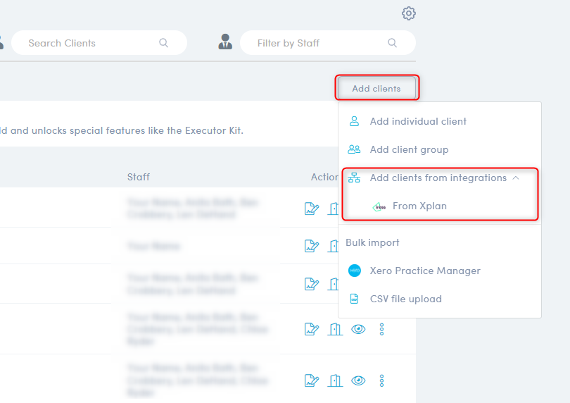 - Navigate to Clients > Client List. Click 'Add clients' > 'Add clients from integrations'> 'From Xplan'.