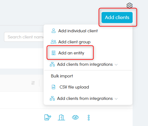 - Navigate to the Client list and select 'Add Clients' > 'Add an entity'