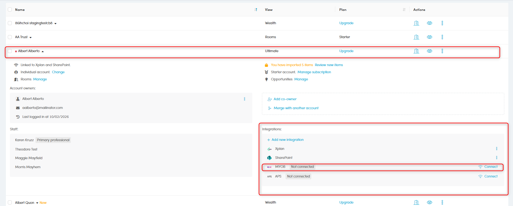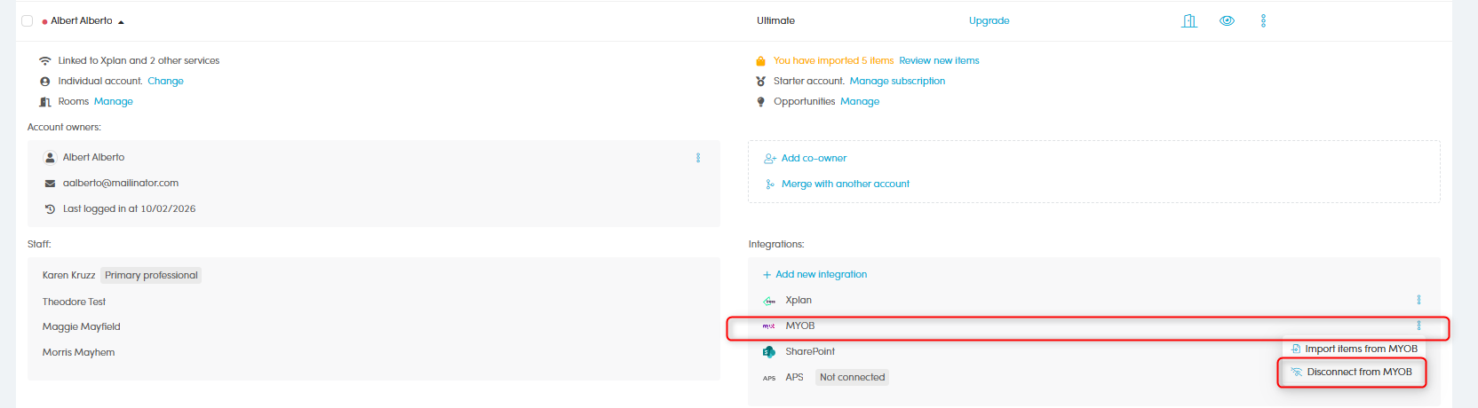 - Click the client name, in the Integrations section, click the 3 dots Action button near MYOB > Disconnect client from MYOB PM