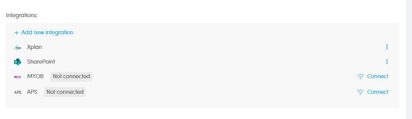 - Click the client name and within the Integrations area>click the 3 dots Action button > MYOB > Connect to MYOB.