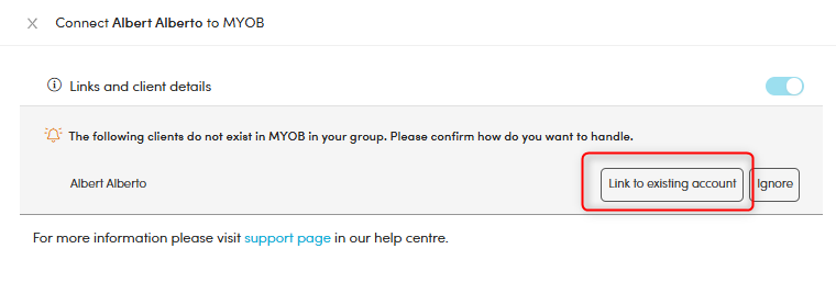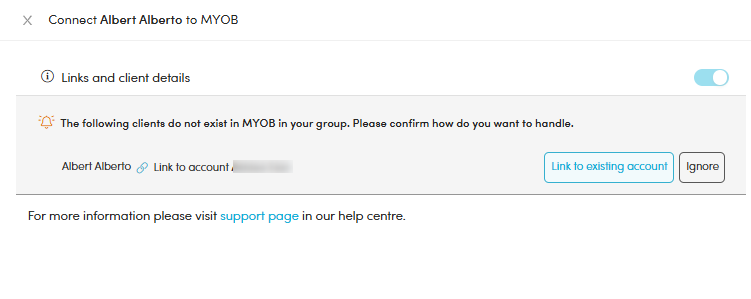 - Once you have selected a Client/entity to link to in MYOB PM, you are taken back to the slide-out window where confirmation of the account you will link to is shown.