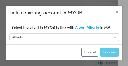 - A slide-out window will appear, asking you to select which client in MYOB PM you want to link to.