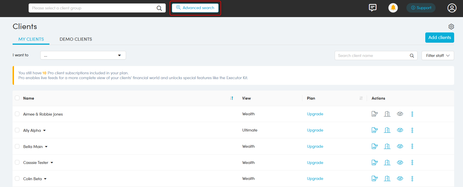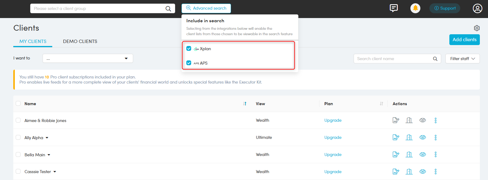 The 'Advanced Search' feature allows you to search for clients that currently belong to your partner portal client list and third party integrated platform lists such as XPM, Xplan, FYI or APS. This assists expediating the creation of new clients in the portal without the double handling.