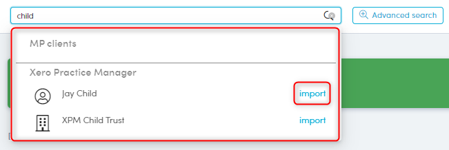 - In the search bar, type the name of the client or entity you are looking for. The dropdown box will show if the client already exists in your portal, or only exists to your chosen integration. If the client does not appear under the 'MP clients' heading, this indicates that they are not an active client in the portal.
