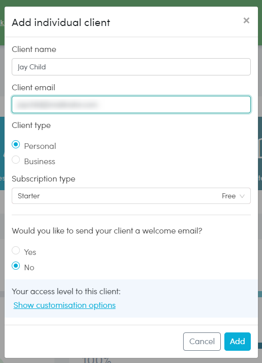 Set the Client type, subscription type and choose whether you want to send the client a welcome email.