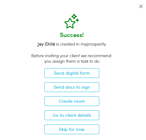 - A success message will display where you can proceed to import client details, or send the entity or client a task to complete. Your client will now appear in the client list.