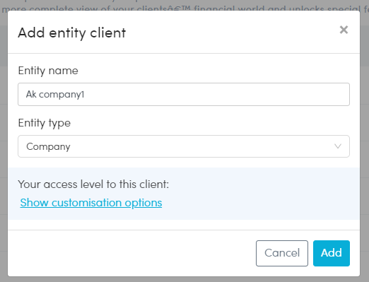 b) If adding an entity as a client, the following window will appear, where you can adjust the Entity name and type before proceeding to add.