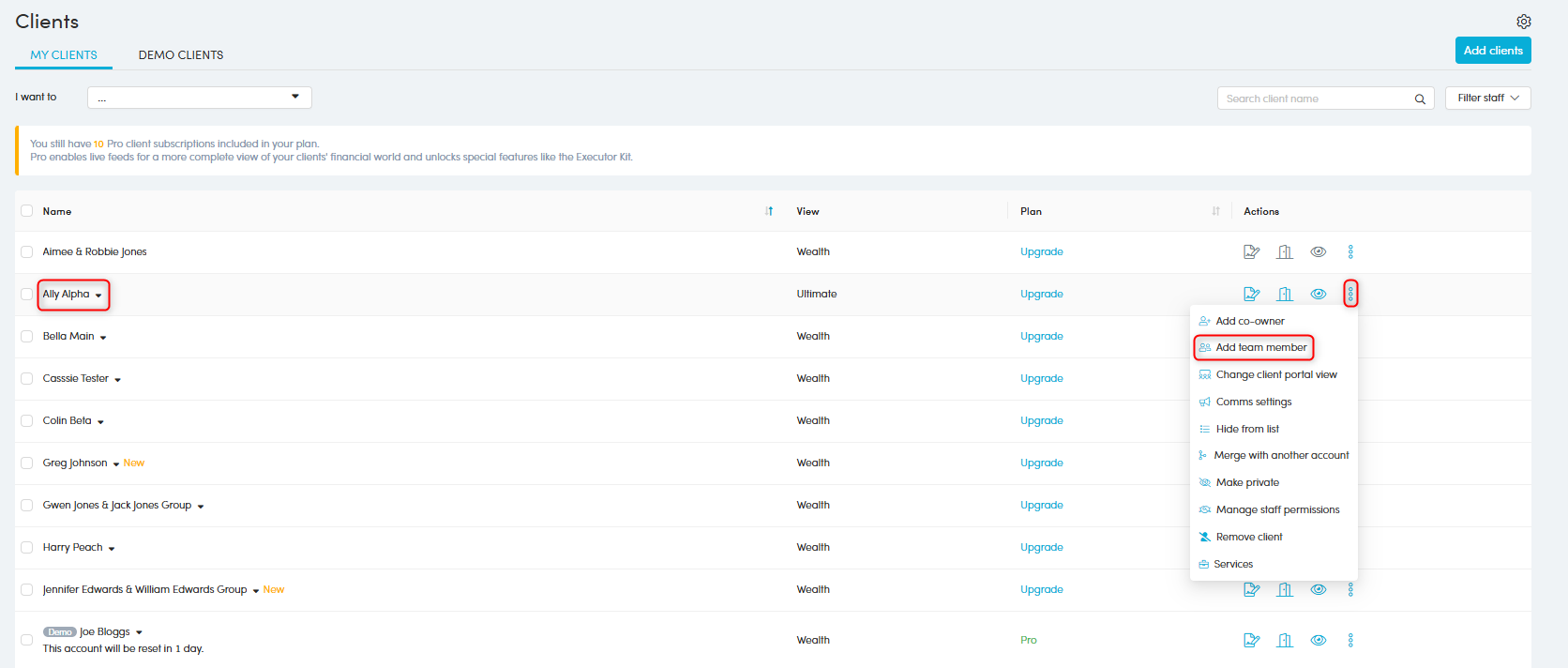 1. Locate the client in the Client list, click 'More actions' > 'Add team member'.