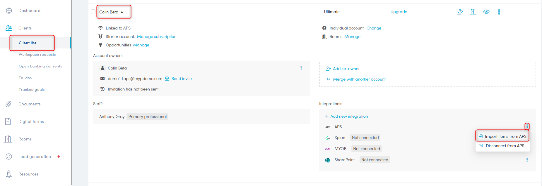 - Navigate to the client via the Client List, click the client’s name to expand their details, then under the Integrations section click the three vertical dots (⋮) next to 'APS' and select 'Import items from APS'.