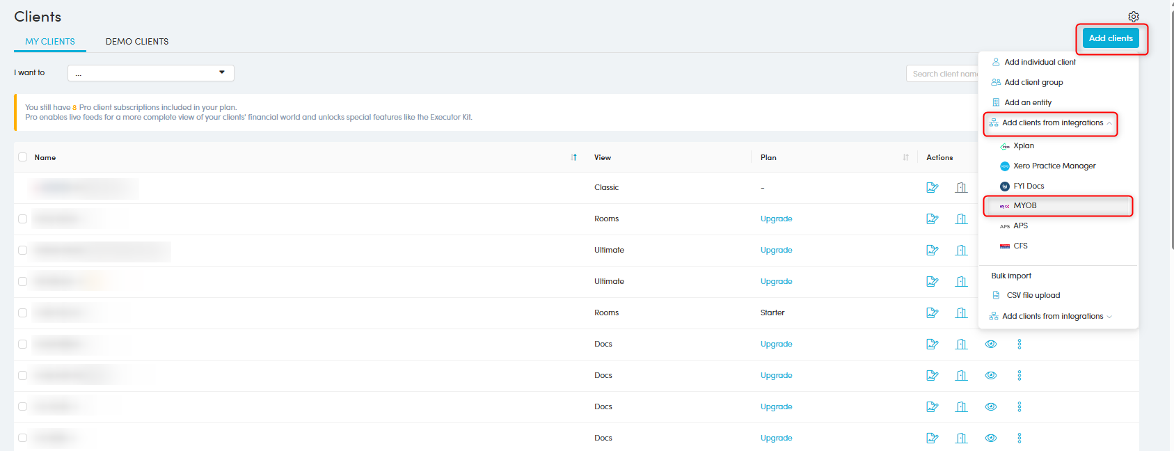 - Select Add clients > Bulk import > Add Clients from integrations > MYOB PM.