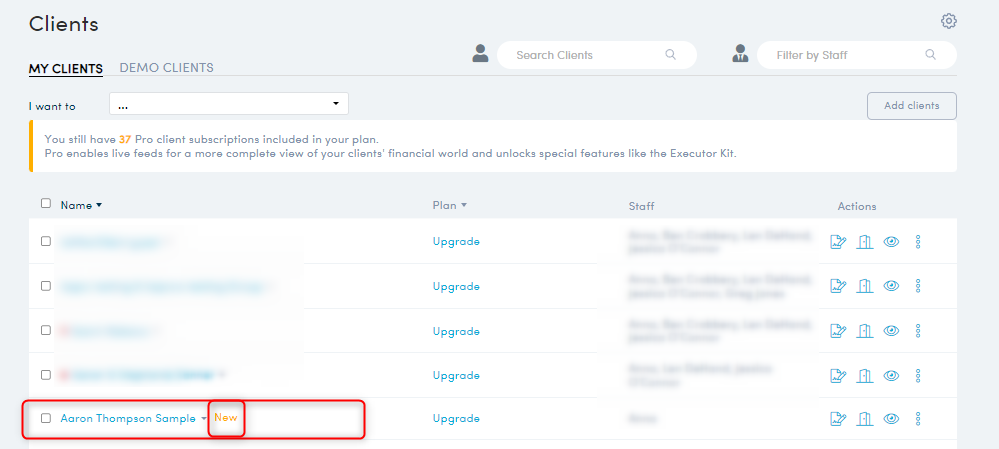 - Clients/entities that were successfully imported will now display in your client list with the word 'New' next to their name. You are now ready to start working with the client/entity.