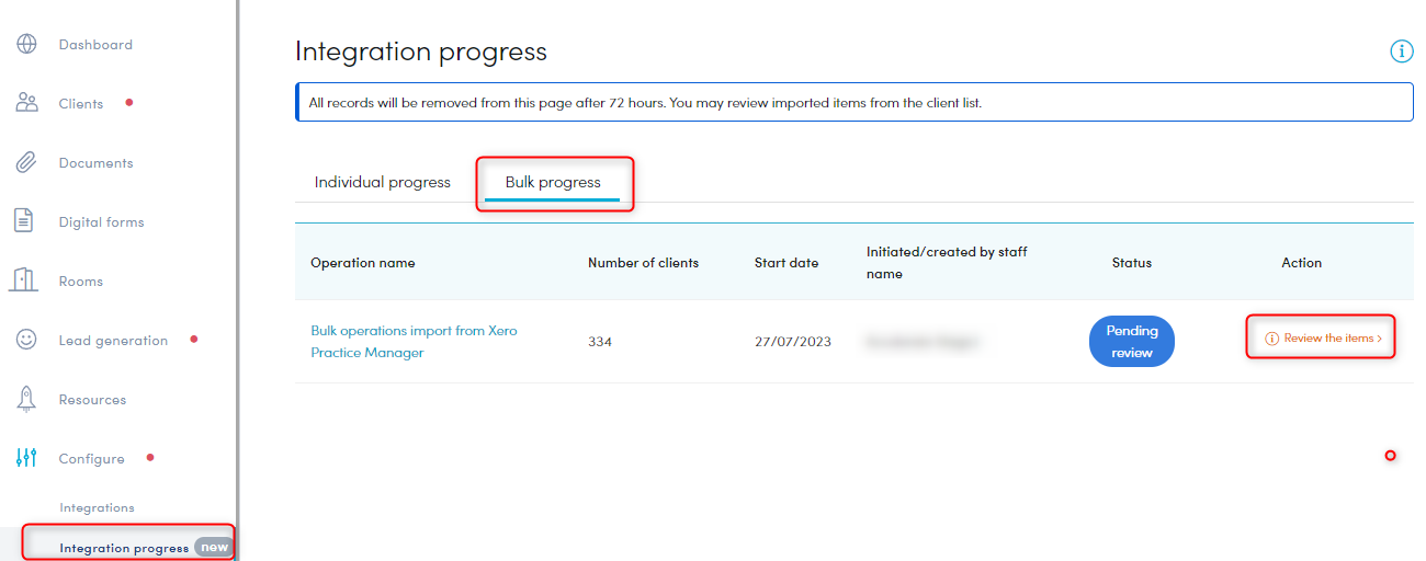 - Visit 'Configure'>'Integration progress'. The the status of the import will change to 'Pending review'.
