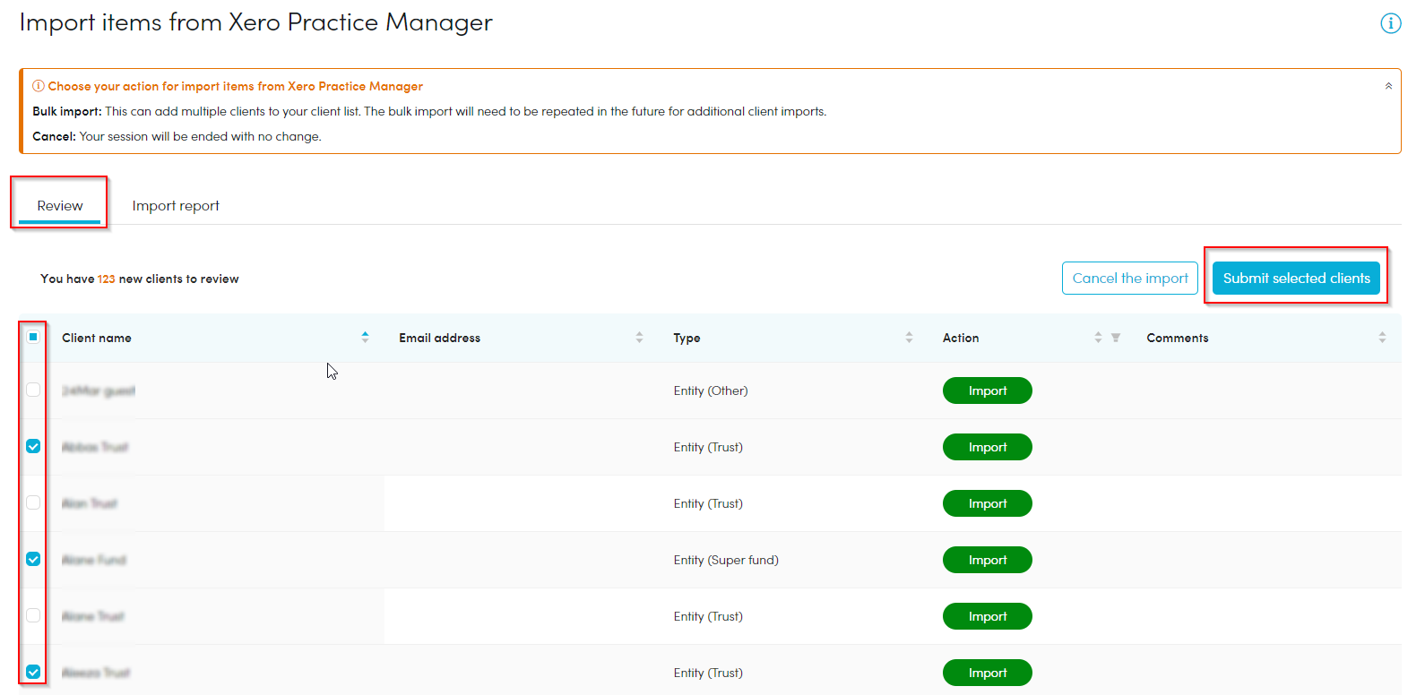 Review the list and mark the checkbox next to the clients/entities names you want to import. Click 'Submit selected clients'.NOTE: To view a list of clients/entities that cannot be imported, click the 'Import report' tab.