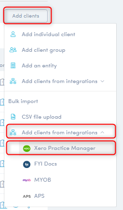 - Select Add clients > Bulk import > Add Clients from integrations > Xero Practice Manager.