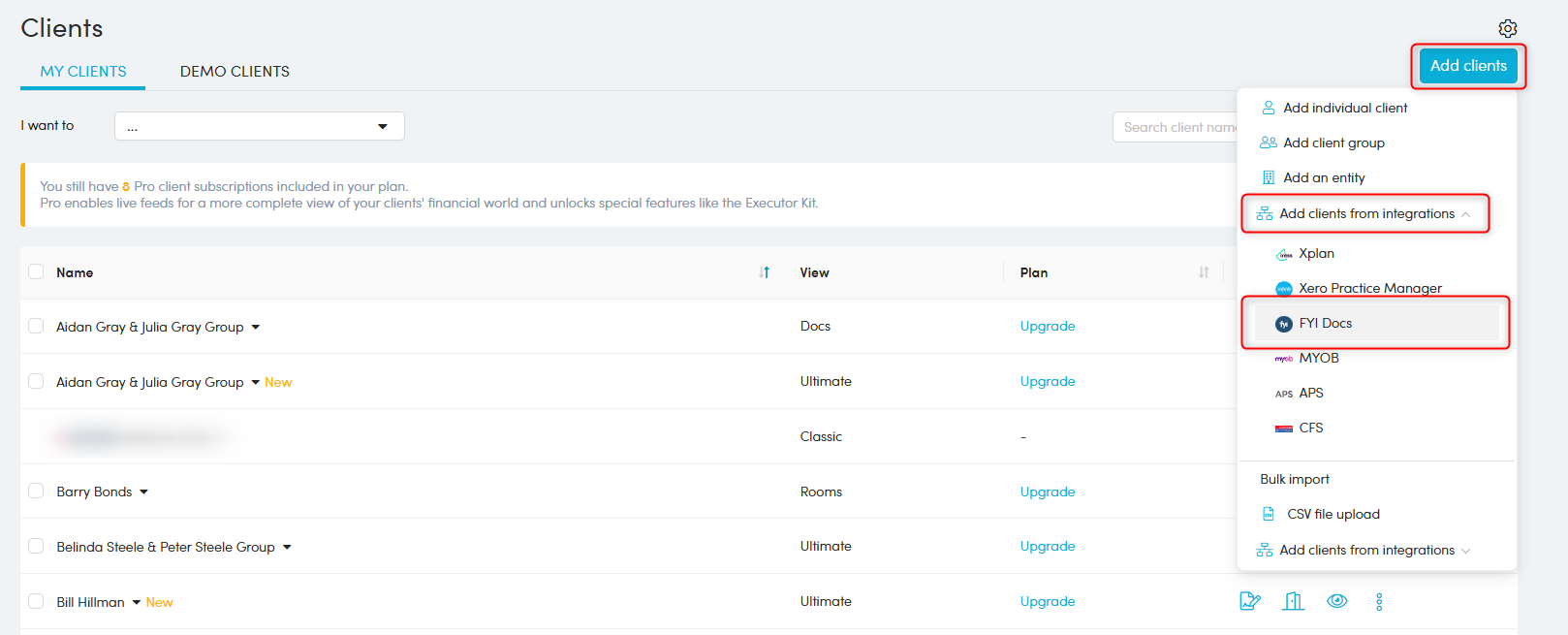 - Select Add clients > from integrations > From FYI Docs
